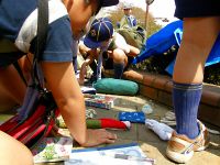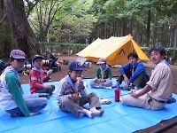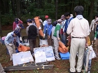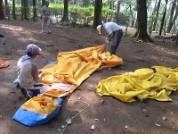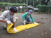 楽しいキャンプには終りがあります(>_<) テントをたたんだり、ペグ(テントやタープを張るロープを地面に固定するもの)を洗ったりです。 片付けは、建てる時より大変だけど、がんばろう!