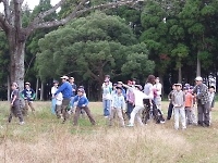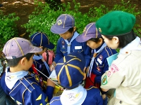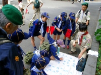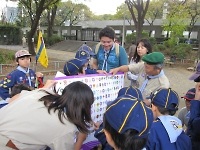 近くの公園で、ポイントラリーを開催!! ポイントリーダー役の組長が、問題を出している様子です。 次長が組をまとめて、ビーバースカウトと一緒にポイントをまわりました。