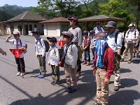 駅前のスペースを使って、開会式! そして、作業着に着替えて組ごとでハイキング開始です♪