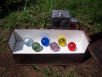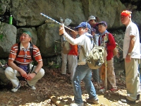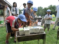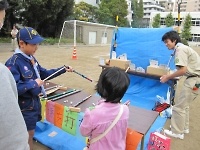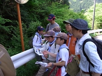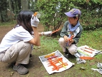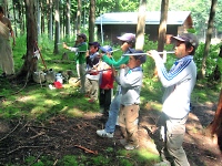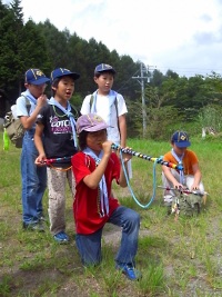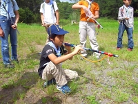 空気砲ポイント。しっかりマトをねらえ!! 双眼鏡を使って、山のふもとに見える手旗を見つけるポイント。 なかなか、見つけることが出来ずに大変でした☆