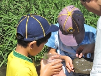 生き物は、水の中だけじゃないよ! ハグロトンボやカマキリ、捕まえた〜♪