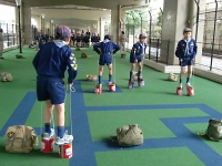 自分たちの持ち物を床に並べて、長い列をつくるゲームです。 長い列をつくるために、制服やハバザックの中身を出して並べています。 勝負にはこだわらないとね♪