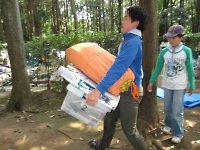 テントや鍋などのキャンプ備品は、自分たちで運びます。