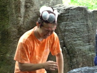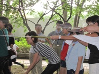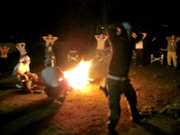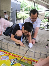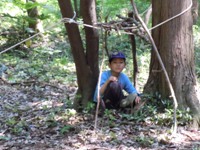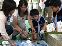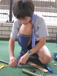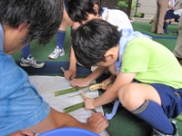 スカウトと一緒に、竹を使って水鉄砲作りをして楽しみました。