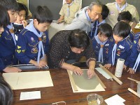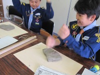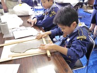 粘土は思った以上に硬いです(^。^;) スカウトたちが軽く押しても平になってはくれません。 体重をかけながら、力いっぱいドンドン!棒でゴロゴロしながら必死に板状に伸ばしました。