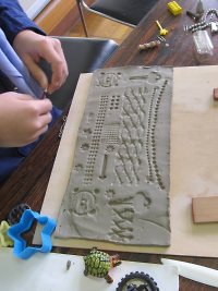 板状になったらデザイン作りです。 竹串の先で模様を描いたり、家から持ってきた玩具のタイヤをゴロゴロ。 または、鍵やチェーンを押し付けて模様を作っているスカウトもいました。 やっぱり芸術は自由ですねヾ(=^▽^=)ノ