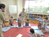 デンリーダーと一緒に「りすの道」を見ながら、カブスカウト隊の「やくそくとさだめ」や「敬礼」などを知ってもらいました。 覚えたことは、パパやママにも話してね(o^∇^o)ノ