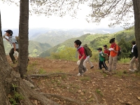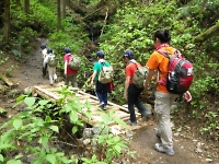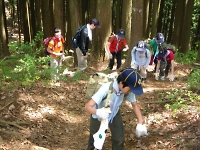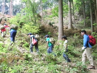 現地に着いたら、ハイキング開始です。 アスファルトの道は照り返しが強く暑かったですが、山道になると土の地面と草木に囲まれ涼しいこと! 周りの草花や生き物を観察しつつ、スカウトたちは軽快に山道を進んでいきます。