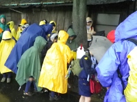 帰りは夕立にあってしまい雨具を着て最寄の駅まで移動しました。 スカウトたちは、雨の中の移動を楽しむように元気いっぱい☆ 湧き出る元気に大人たちはビックリしていました。