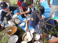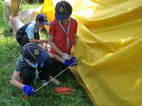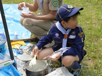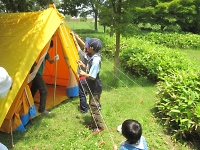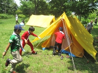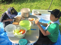 キャンプの朝は、やることがいっぱいです。 朝食作りから始まって、テントの点検や朝礼などなど大変です。 組の皆と協力し合って負けずにがんばろう!!