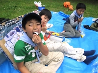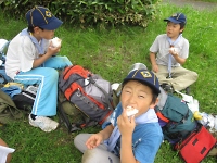 ゲームの成果か!?テントの撤営(てつえい)作業もスムーズに終わって、待ちに待ったお昼の時間です。 自分たちで作ったおにぎりは実に美味しく、ほおばりながら食べているのが印象的でした(o^∇^o)ノ