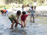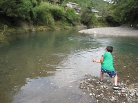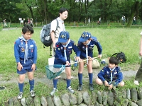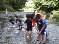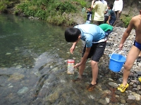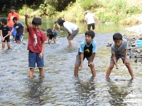 釣りの後は川遊びです。 釣りをする前に仕掛けた"もんどり"を川から引き上げてみると、入っていない組もありましたが魚やエビ、沢ガニが中に入っていました。 お次は、水切り遊びです。 経験がないスカウトは直ぐにドボンと沈み・・・ 経験のあるスカウトは、綺麗な波紋を作りながら遠くまで飛ばし得意気な姿が印象的でした。 うまく飛ばせなかったスカウトは、次こそリベンジだ!! (マウスオーバーで写真が変わります)