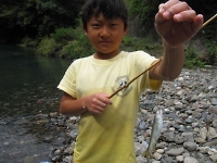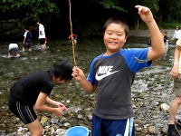 組ごとで川に入り釣り開始です♪ 釣り方は簡単で、中腰の姿勢で竿を水の中に入れます。 そして、竿を前後に少し動かし止めるを繰り返すだけ・・・ 肝心な釣果は、川の流れのせいかアタリが解りづらく悪戦苦闘で、リーダーたちも必死の熱血指導です☆