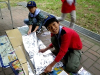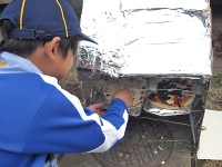 作り方は、空のダンボールを開いて内側に両面テープ。 その上にアルミホイルを貼り付けます。 そして、蓋の部分を片側だけダンボール状態に戻して、太目の針金を2本平行に差込みピザを置く台を作りました。 スカウトたちは、美味しく焼けるオーブンを作るために慎重かつ丁寧に作業をしていました。
