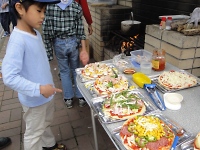 スカウトたちが持ってきた具材をピザにのせます。 大きなウインナー、ツナやコーン・・・ 人によっては、バナナ、パイナップル、レーズンなど具材もさまざまで、まさに自由で楽しいクッキングですヾ(=^▽^=)ノ あとは、生焼けだけを避けたいところです(;^_^A