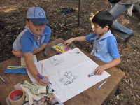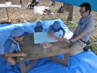班の皆と一緒に建てたタープの下で、班の旗作りです。 カッコいい班の名前と旗のデザインを作ろうね♪