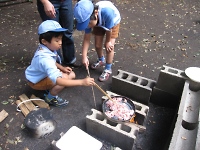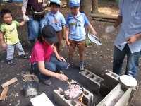 竹で立ちかまどを作りマキで料理をする。環境保護を考慮し直火はNG。