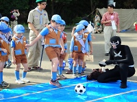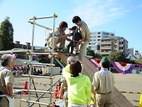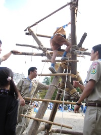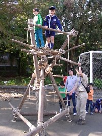 ボーイスカウト隊が丸太とロープで信号塔を作ってくれました。 子供たちは高いところがなぜだか大好きです。元気よく登っていました。 そして、ボーイスカウトのお兄さんたちが信号塔の上から手旗信号の実演をしてくれました。