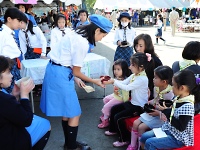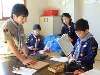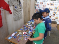 ほかにも、ガールスカウトの皆さんが担当された茶道ポイントでは、ガールスカウトの子供たちがお茶をたててくれました。 そして、活動報告として各年代の活動写真や文京5団の歴史がつまった制服やワッペンなどを展示しました。
