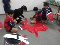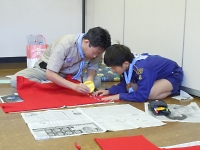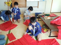 衣装作りでは、カラーゴミ袋や赤や緑の布を持ち寄って衣装を作りましたが、スカウトたちだけで衣装を作るのは大変です。 デンコーチやデンリーダーの力を借りつつ衣装を作りました。