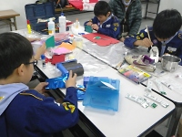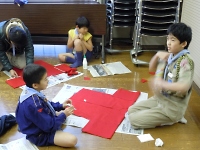 今年のクリスマス隊集会は、各組でクリマスソングの歌対決&クリマス衣装コンテストをすることになりました。 そして、サンタに願いを込めて!?スカウトたちが欲しいクリマスプレゼントを方眼紙や粘土などで作り発表もします。 そこで、組集会に色々な材料を持ち寄って、組ごとで衣装&プレゼント作りをしました。