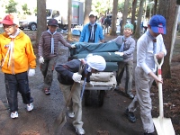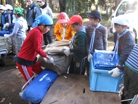 キャンプで利用する班備品のテントやテーブルをはじめ、隊本部で利用する隊備品を協力しあって運びました。 重い荷物は、班長たちの指示で二輪台車に乗せて運び設営準備完了です。