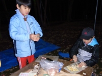 夕食準備もリーダーたちはいません。 体験キャンプといえども、年下のスカウトが野菜などの洗い物や切る作業をします。 手元に気をつけて食材を切ろう!