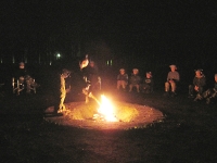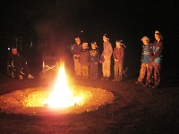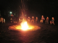 夜は、営火(キャンプファイアー)の時間です。 各班の出し物の歌やスタンツ(演劇)をはじめ、みんなで踊るダンスなどをして楽しみました。