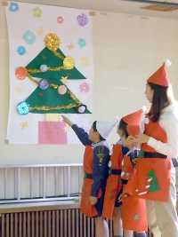 今日作ったクリスマスツリーについても発表をしてくれました。 同じ材料を配っているのですが、魚が泳ぐツリーや惑星が浮かぶツリーなど各組とも個性がいっぱいでした☆