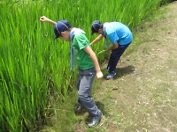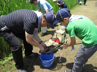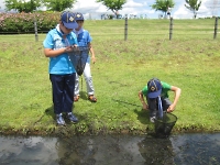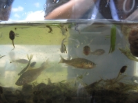 手賀沼に注ぎ込む大津川周辺の水路でガサガサをしました。 水路に網を入れて壁側に動かし水生生物を網に追い込みます。 アマガエル、おたまじゃくし、タナゴ、ドジョウ、ヌカエビなどを、たくさん捕まえ観察することができました。