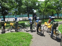 自転車の乗り方やマナーなどの説明をリーダーから受けてから、組ごとでレンタル自転車にまたがりツーリング!?サイクリング開始です。