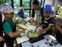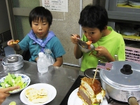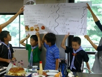 やっとお昼ご飯です。 お互いの組で作った各国の料理を食べあいながら楽しみました。 なかでも、フランスのヴィシソワーズにはコクがあって美味しく。 イタリアのパンナコッタは、甘くてリーダー・スカウト共々大人気でした。