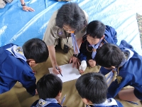 切り傷、鼻血、ねんざなどのポイントを5箇所作って、ポイントラリー形式で救急法を学びました。 話だけを聞いていても覚えられないので、聞いた処置内容を思い出しながら傷の手当てを擬似的に行ってもらいました。