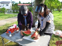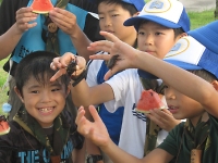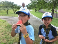 ハイキングから戻ると甘いスイカが待っていました。 スカウトたちは、美味しくスイカを食べたりスイカジャンケンをして盛り上がりました☆