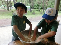 制服から作業着に着替えて、手作りピザに挑戦です。 ピザ生地をこねる作業は意外と重労働で、手に付く生地を取りつつ、スカウト同士交代しながら頑張りました。 ピザに乗せる食材もいっぱいで、トマト、ピーマン、ベーコンなどを、みんなで協力しながら切りました♪