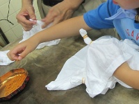 輪ゴムを使って絞り染めの模様を作ります。どんな模様ができるかな? |