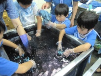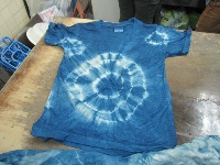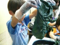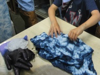 | 手袋をつけて、藍液にTシャツを浸します。独特のにおいにもめげず、真剣なまなざしです。 | ![]() |