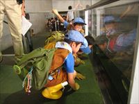 再度藍液に浸します。これを何回か繰り返します。作業中に制服に藍液がつかないように気をつけよう。 |