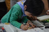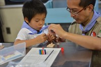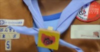 カブ隊以上ではネッカチーフは縦にそろえますが、ビーバー隊ではヨコに留めます。
