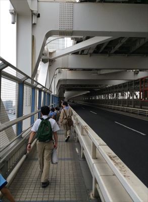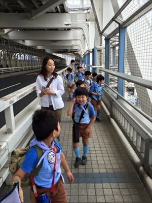 ブリッジのたもとからのぼると歩道にでます。絶景を横に見ながら、幼稚園年長から小学生まで、みんな元気に完歩できました。 熱中症対策に、水分補給をしっかり行います。