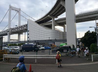 三田駅から歩いてレインボーブリッジに向かいます。生憎の空模様…雨が降るかも…?な天気予報でしたが、ちらほら太陽も見えて暑いくらいです。