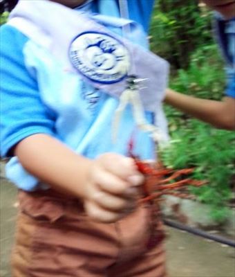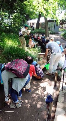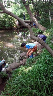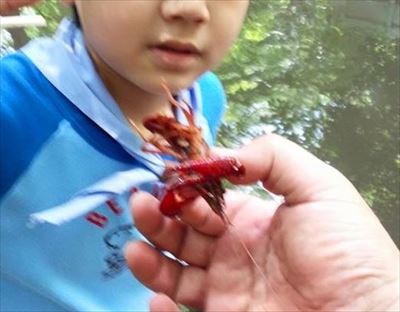 ザリガニ釣りにチャレンジしました。スカウトは状況に応じて釣り場を移動して、予定の行動範囲で十分ザリガニを採ることができました。