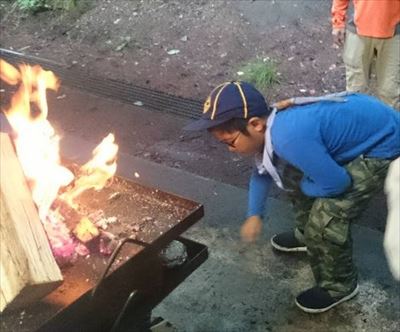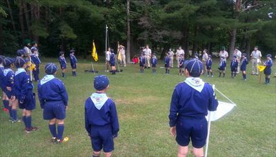 カブ隊の夏キャンプは、開村式から始まります。当番班の組長(くまスカウト:5年生)が国旗開きをします。