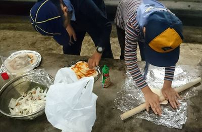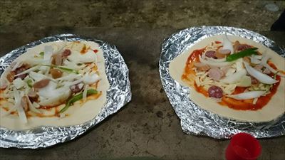 食事は、くじ引きで割り当てられた食材を工夫して、ピザ作り。