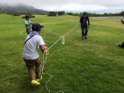 ポイントで実施しているのは、ペットボトルにロープをかけて運ぶゲーム。 きちんとロープワークを習得して落ちないように素早く結べるか、チームワークよく作業できるかで成績が変わります。