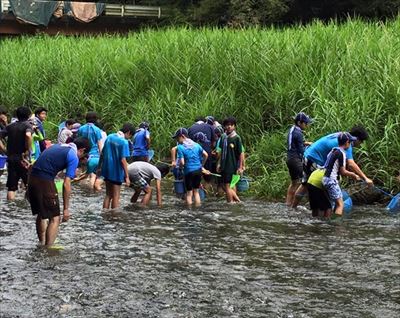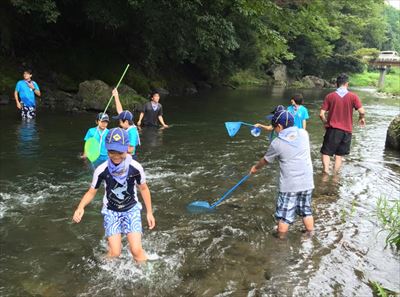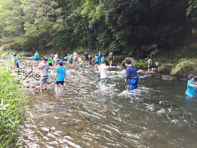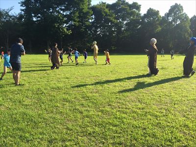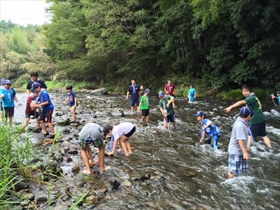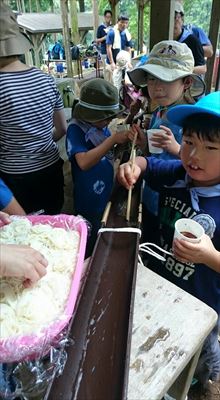 7月のクラフト集会で作った吹き矢で的を倒し、肉をゲット! アイスクリームを自分で作ったり、流しそうめんを楽しみました。