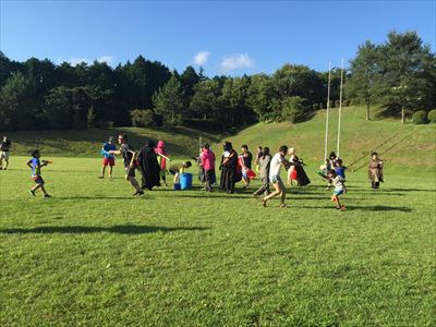 うさぎとキツネゲーム。キツネにタッチされたら怪我します。怪我したところをかばって走ることになります。