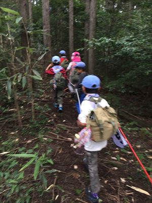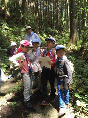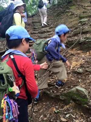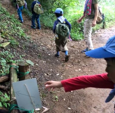 追跡サインを見ながらコースをたどる、本格的なハイキング。組のメンバーで助け合いながら進みます。