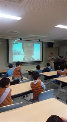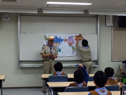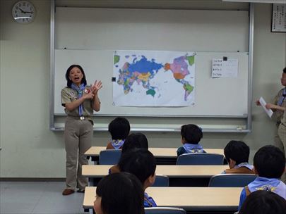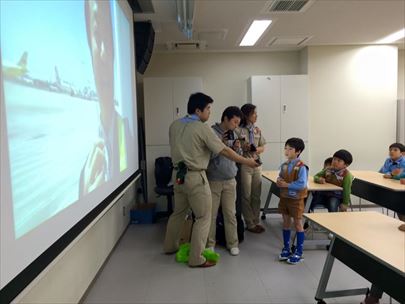 過去ビーバー隊の隊長で、現在オーストラリアにいるS副長とプロジェクタを使ってLINEでテレビ電話をしました。お久しぶりのS副長登場に、スカウト達から質問の嵐でした。でも、 スカウトよりも、指導者、保護者のほうがはしゃいでいた?