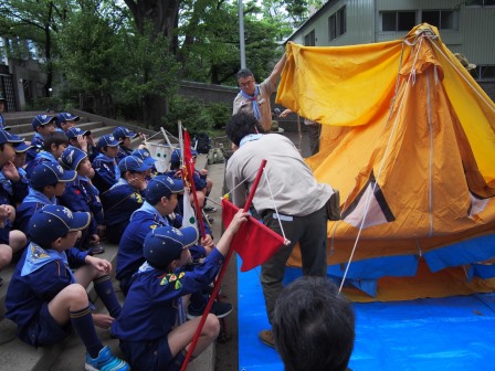 開会式後は、設営です。前回の集会で習得したテントの張り方を早速試すことができます。各組毎に分かれて、テントを立てます。それぞれのスカウトが自分の役割を務めて、立派なテントを張ることができました。